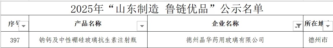 2025年12月1日,山東省工業和信息化廳公布了2025年第一批“山東制造·魯鏈優品”名單。德州晶華藥用玻璃有限公司生產的鈉鈣及中硼硅玻璃抗生素注射瓶憑借其卓越品質成功入選。