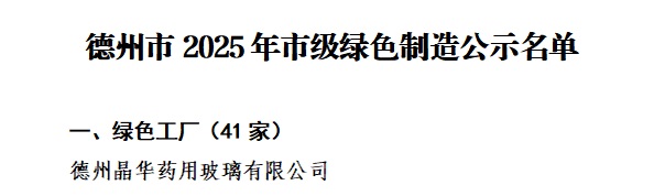 2025年5月,德州晶華藥用玻璃有限公司成功獲評(píng)德州市2025年度市級(jí)“綠色工廠”。